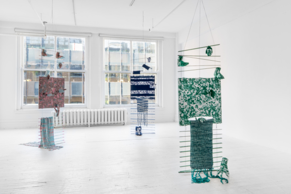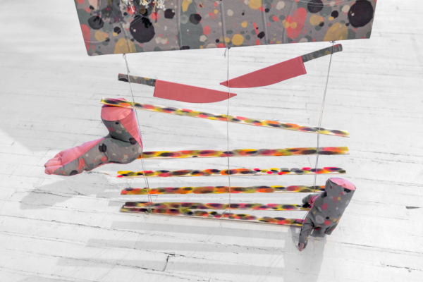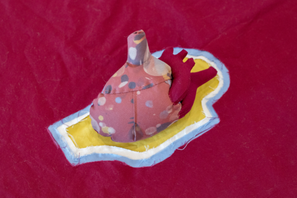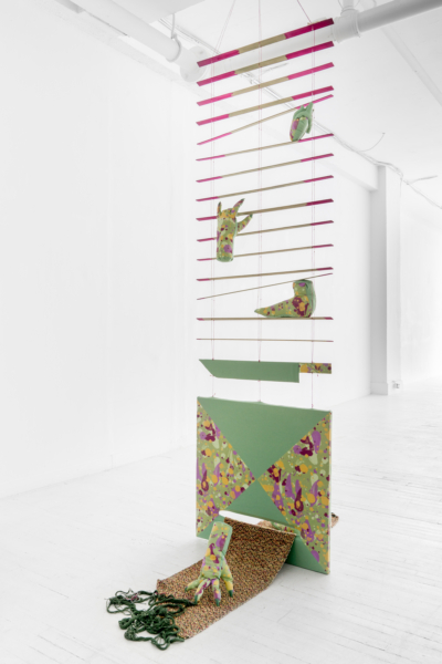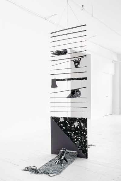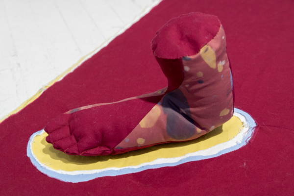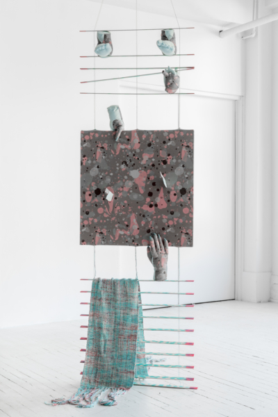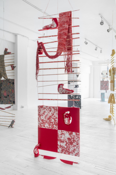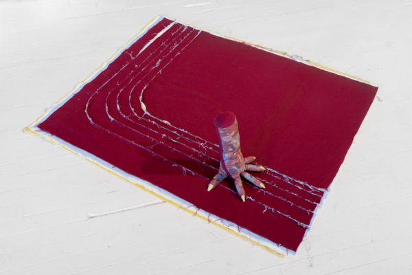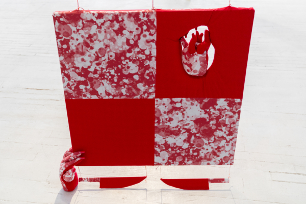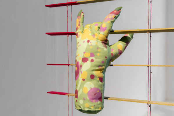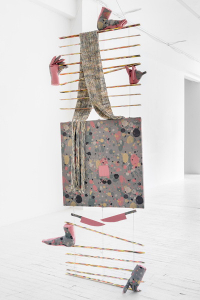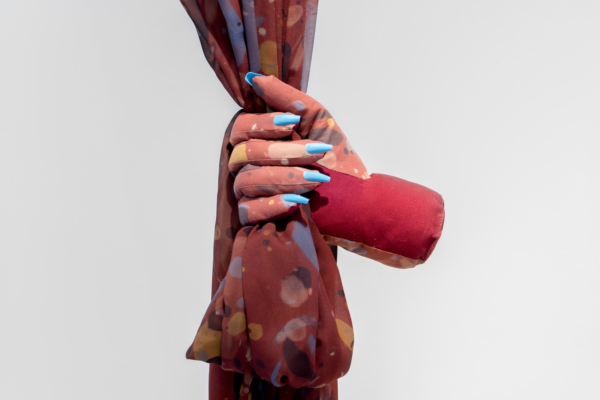 Les palettes agréables et l’artisanat soigné des projets de sculptures douces de Yumang camouflent dans un premier temps tous les démembrements disséminés dans ces pièces. Les mains, les pieds et les organes internes sont déchirés, composés de textiles décoratifs qui se coordonnent avec les couteaux, les haches et autres armes et ponctuent ce désordre corporel. Une fusion improbable entre le déchaînement d’un film d’horreur et les rêveries fonctionnellement obsolètes des aspirations de la classe moyenne présage de la représentation que fait Yumang de l’homosexuel en tant qu’interlocuteur déviant – à différents degrés : pervers, paranoïaque, casanier et hystérique.