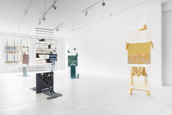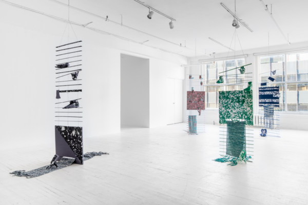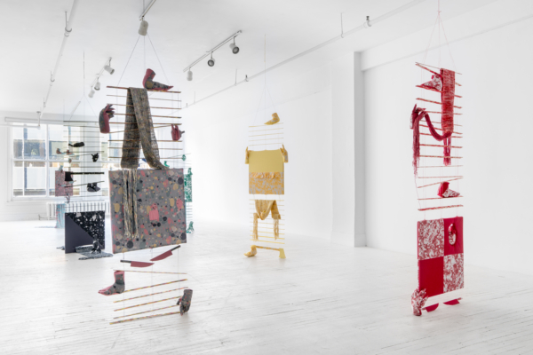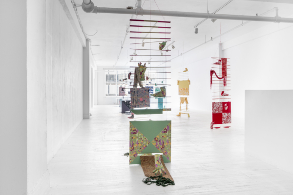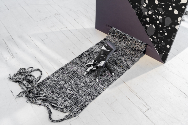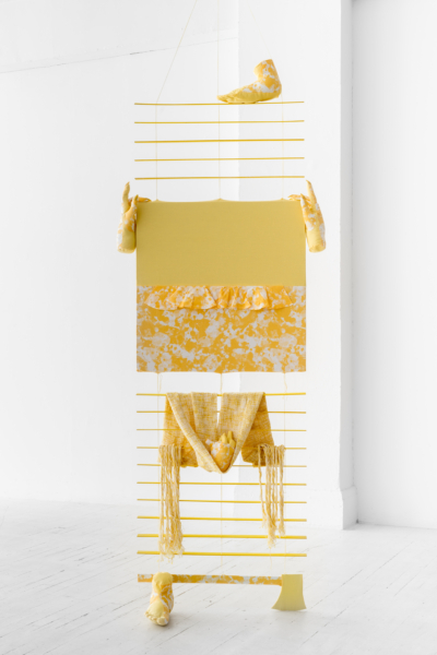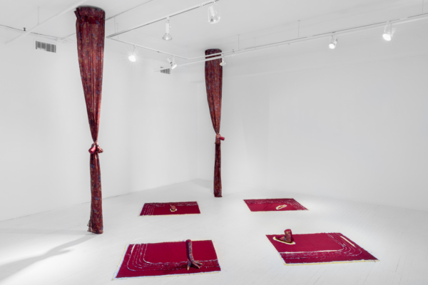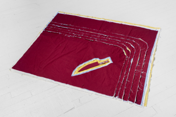 La sphère privée mérite d’être scrutée. Dans son mélange de couture, de décoration intérieure, de gravure et d’une panoplie de ce que l’on appelle les « arts domestiques », Jade Yumang développe un point de vue à partir duquel les effets des formes particulières de privatisation du capitalisme sont soumis à une analyse queer/ed. Le principe de la vie privée a longtemps servi à protéger toutes sortes d’oppressions qui, trop souvent, ne sont pas prises en compte, ni même reconnues : la violence domestique, la répression des pratiques sexuelles non normatives et une économie d’exclusion qui consolide la richesse des classes supérieures ne sont que quelques exemples des préjudices qui se cachent dans les recoins intérieurs de la vie privée. À ce propos, nous pourrions rappeler que les premières lois écrites qui ont dicté la propriété de biens privés s’appliquaient aux femmes et aux enfants en tant qu’esclaves à Rome. Les assemblages de Yumang vont jusqu’à insister sur la nécessité de se souvenir des enjeux incarnés qui naviguent derrière les rideaux fermés, les stores fermés, les portes et les portes de placard fermées. Citant les exercices de contrôle et d’être contrôlé qui caractérisent la femme au foyer, Yumang agrège les tropes de l’espace domestique en fragments désorientants. Des rideaux froncés et d’autres traitements de fenêtres, des tapis et des couvertures tissés, ainsi que des papiers peints et des revêtements de sol cités ont été assemblés pour former une scène psychologiquement éprouvante. En particulier, Yumang positionne les « éclaboussures gaies » des carreaux de sol en vinyle populaires du milieu du siècle dernier comme une sorte de présage d’une série de violences innomable – physiques, psychiques, symboliques – s’échappant des contours de l’hétéronormativité et de ses pressions d’assimilation.
