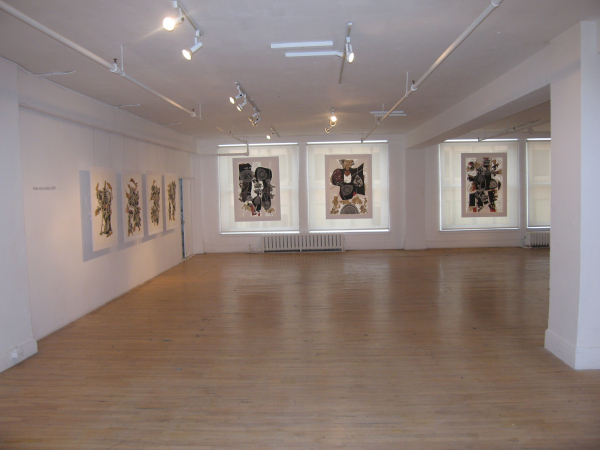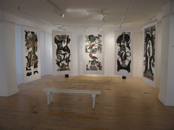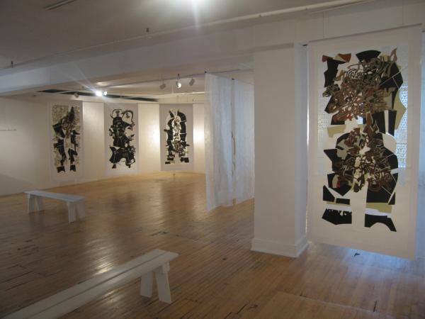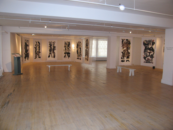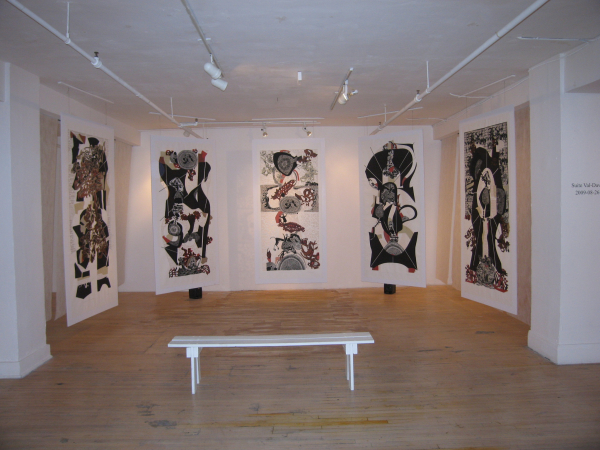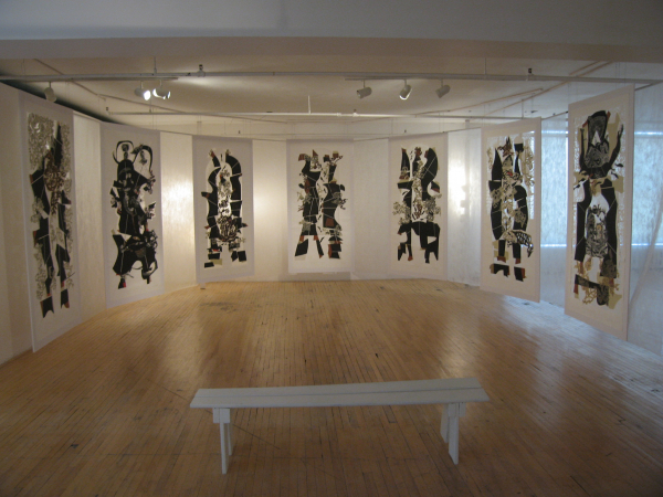 1999 aura été pour René Derouin une année de consécration. Rétrospective, distinction, prix, médaille… tout lui est accordé. Toute la reconnaissance publique et officielle qu’un artiste d’ici peut espérer, il l’obtient cette année-là. Mais voilà : y a-t-il encore une vie de création, après le succès? La question le ronge, au point que, c’est lui-même qu’il interroge et remet en question. Et comme chaque fois, il repart à zéro : le noir, le blanc, avec les moyens les plus pauvres : papier, feutre, photocopie, découpage et collage, c’est tout. Ni bois gravé, ni céramique, ni rehauts d’or en peinture. La réponse ne se fait pas attendre. Naît une surprenante série : les Lacs (2000), qu’il faut regarder comme la matrice d’un grand nombre des oeuvres ou des dispositifs qui vont suivre. En effet, ce sont ces Lacs que l’on retrouve sous forme de miroirs au fond des barques de l’installation Or et sel (2007). On constate d’ailleurs qu’ils animent déjà Hiver noir (2001), tandis qu’ils hantent encore l’actuelle série Chapelle/Capilla (2009). Surtout, ils préfigurent un nouveau système narratif, déjà lisible dans Hiver noir, qui s’approprie l’Histoire de l’art selon un découpage symbolique parfaitement arbitraire, au moyen duquel l’artiste va affirmer sa singularité universelle. Revisiter l’Histoire collective à la lumière de l’histoire personnelle; celle-ci fournissant et justifiant le sens de son interprétation. Ainsi faut-il lire : Trois siècles de migration sur le territoire des Amériques (2004) qui s’inspire, comme Paraiso – la dualité du baroque (1997), du métissage pictural et religieux des Toltèques, ornant leurs églises d’un « baroque fou »; ou encore Chapelle/Capilla (2009), ascèse de la pérégrination des migrants, ramenant la dérive des barques d’Or et sel (2007) dans l’ordre du sacré : ordre et beauté de la chapelle d’enfance (celle de St-François-d’Assise-de-la-Longue-Pointe). « J’y retrouve sans censure, écrit l’artiste, une part de mes références au patrimoine religieux. Mon imaginaire d’enfant me revient comme un premier regard émerveillé… » (in Graveline, P., Les cent plus beaux poèmes québécois, Fides, Mtl, 2007).