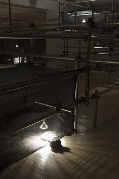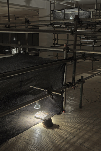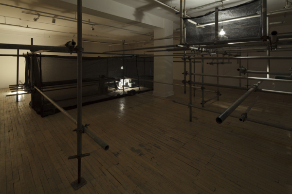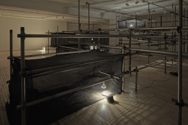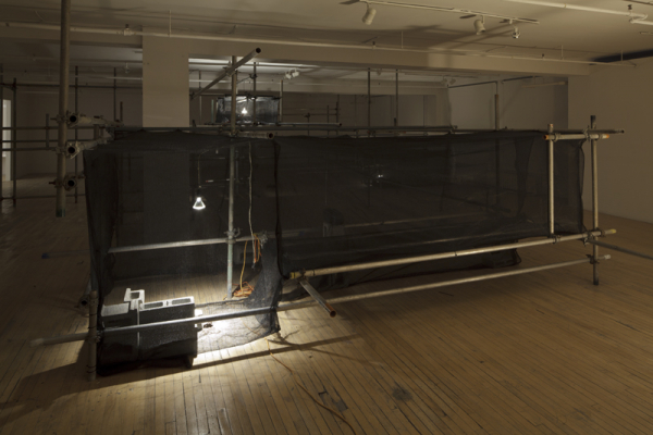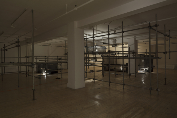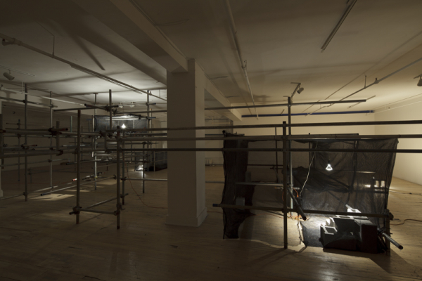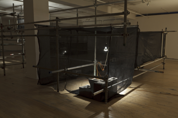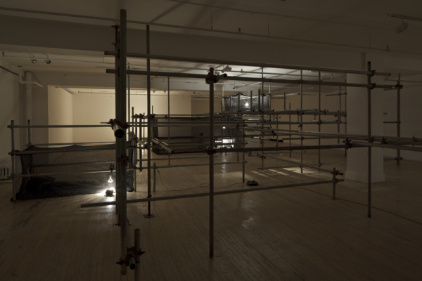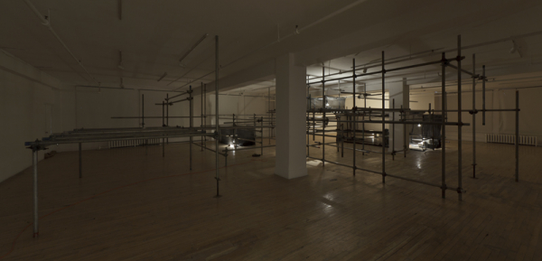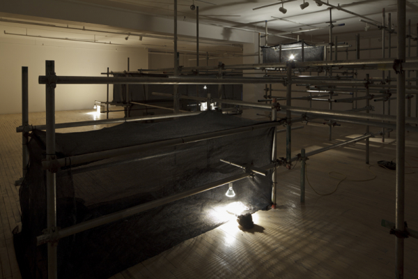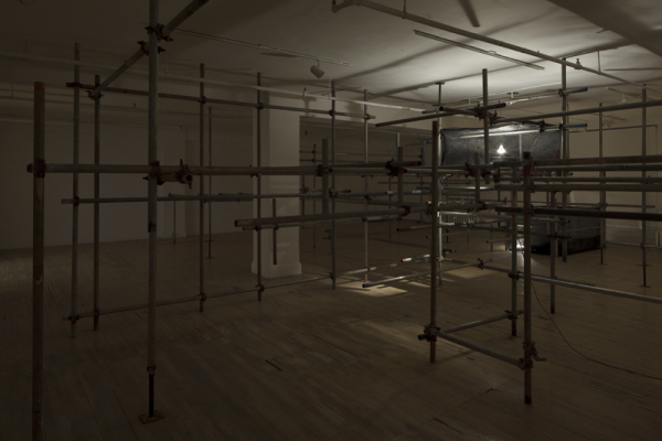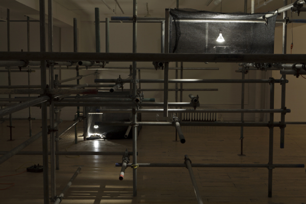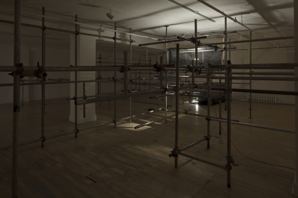 C’est en référence à cette interstice où les battements de l’environnement modulent l’expérience que s’inscrit la présente installation. La rigidité métallique de l’échafaudage, sa rigueur orthogonale, agit comme une grille grand format évoquant tant un soubassement qu’une structure dominante. La fonction utilitaire de l’objet est alors mise à distance, sans pour autant le réduire à un pur objet formel. Élément central de l’installation, l’échafaudage instaure différentes formes de contrastes qui, malgré leur forte présence matérielle, sont dominées par une charge métaphorique. C’est ainsi que le filet noir qui se rattache à la structure statique, laissant par endroits traverser la lumière, superpose une autre grille de lecture, une autre manière de filtrer.