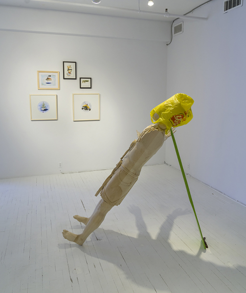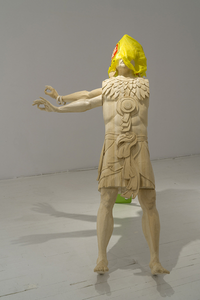 Dans les sculptures comme dans les œuvres sur papier, les multiples éléments assemblés agissent à la fois comme unités structurant la composition et comme vocables dont l’adjonction crée du sens, sinon une forme de récit. C’est ainsi que se lisent ces emprunts à l’imagerie autochtone nord-américaine et aux arts précolombiens qui, en superposant différentes temporalités et différents lieux, élargissent la notion de territoire à une construction qui ne repose pas uniquement sur une définition spatio-temporelle. Ce métissage de signes active un effet d’étrangeté souvent opérant dans les œuvres de Roy, lorsqu’elles forcent la rencontre d’éléments hétérogènes. Ceux-ci se juxtaposent ou se fondent en objets composites, telle cette pyramide à l’allure de bateau et de camion, à mi-chemin entre les jeux formels et l’édification d’une mythologie. Il en va de même pour cette sculpture grandeur nature en parfait équilibre au confluent du commun et de la tradition sacralisante. Le tiraillement entre ces deux lexiques semble provenir autant d’une expérience intuitive et incarnée de la nature à laquelle se prête la ruralité, que de la mise en doute des identités nationales dans un contexte de mondialisation. Face à l’effritement d’une conception du pays comme ensemble structurant et unificateur, des mécanismes d’identification à des concepts plus larges sont maintenant exploités; ici, l’américanité, dans toute la complexité de ses mythes fondateurs. Paradoxalement, ce regard globalisant est souvent assorti, comme c’est le cas chez Roy, d’un intérêt pour le micro-local et les spécificités de son environnement physique ou humain immédiat.
