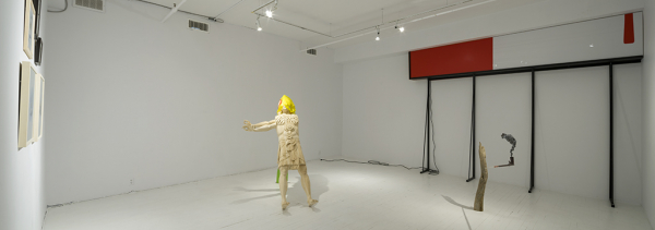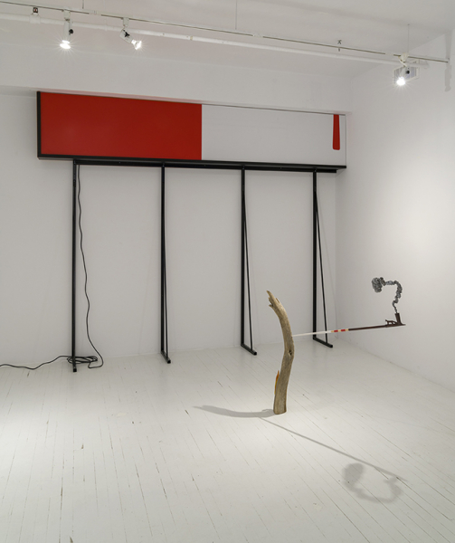 Dans un coin de la salle d’exposition, une boîte lumineuse montée sur de très hautes pattes, s’élevant presque jusqu’au plafond, arbore une composition rappelant sans conteste les couleurs et les formes du drapeau canadien. Ainsi collée contre le mur, cette boîte se révèle comme un fragment, dont on imagine le tout se poursuivre hors de notre champ de vision. De ce fait, son statut de symbole est réduit à une simple abstraction picturale, la seule dans un univers structuré par les volumes, les matières et les formes de la sculpture. La boucle se referme; ce plan de grandes zones de couleurs se donne, telle une ultime déconstruction du paysage, l’évocation d’un territoire morcelé et porté aux limites de ses conditions d’intelligibilité et de visibilité.