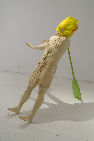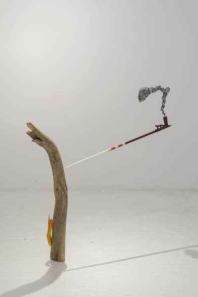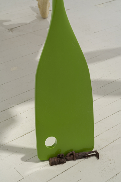 Le paysage est ici envisagé plus largement que la simple représentation d’un lieu donné. Il convoque la notion de territoire qui renvoie autant à une délimitation mentale subjective qu’à un contexte social, géographique ou culturel particulier, à partir duquel se développent et se définissent les identités. Ainsi, l’artiste investigue la préconception selon laquelle l’identité nationale ou ethnique est intimement liée au territoire naturel, un postulat qui parcourt notamment l’histoire de la peinture paysagiste au Canada. C’est donc sans surprise qu’est perceptible, ça et là, une part de vernaculaire associé à l’imagerie des régions éloignées et des terres forestières, sans toutefois évoquer un quelconque provincialisme folklorique. Ancrée dans la contemporanéité, la ruralité dont nous parle Roy participe de cet ordinaire qui échappe normalement à la représentation : les pagaies sur lesquelles repose cette grande sculpture, laquées comme seuls peuvent l’être les objets industriels, constituent simplement des symptômes d’un mode de vie spécifique à son contexte géographique. Il en va de même pour les pièges de trappage ou les châssis de machinerie, signes du quotidien qui, lorsqu’ils en sont extraits, deviennent les reliquats d’une culture souvent occultée au profit d’une vision pittoresque.