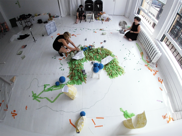 Depuis quelque temps, j’ai installé mon tapis de yoga et certains équipements de mise en forme dans l’atelier. Ces objets sportifs côtoient des prototypes, des accumulations de matériaux, des images imprimées et des objets sculpturaux. Cet espace partagé entre la création et la mise en forme m’inspire de nouveaux dispositifs de mise en espace et de nouvelles stratégies permettant d’engager la participation et la cocréation.