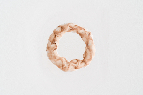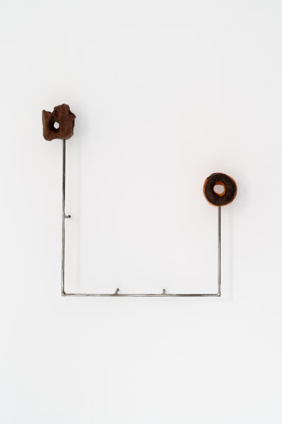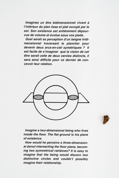 Les propriétés mathématiques d’un beigne poursuit cette réflexion sur la confusion des sens à travers la déroute de la forme. En empruntant au champ mathématique de la topologie certains concepts, Tomassini aborde l’anatomie de ses sculptures comme une suite de possibilités infinies dans l’espace limité d’une surface donnée. La pierre qui devient un beigne reprend cette idée d’un état profondément malléable à l’intérieur des contraintes d’une même superficie. Tomassini approche le sens et la morphologie d’un objet à la manière d’un ruban de Mœbius; cette ceinture qui apparaît d’abord comme étant composée de deux plans étrangers se révèle, par une spécieuse inversion, à n’être au fond que la même surface qui tourne en boucle sur elle-même.