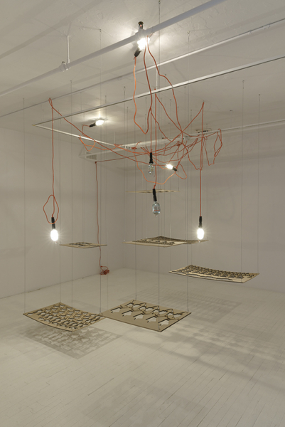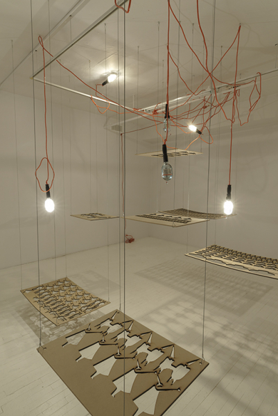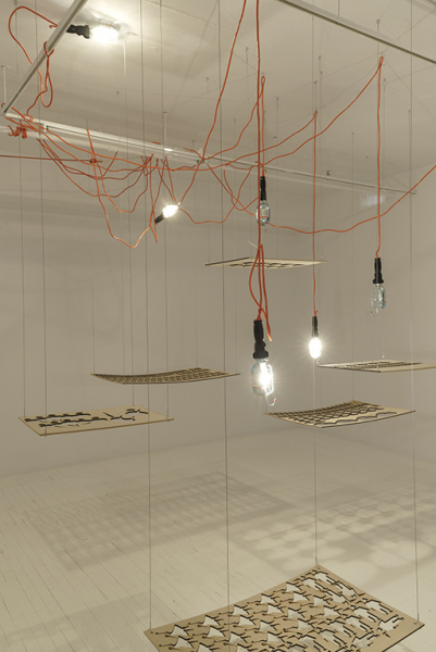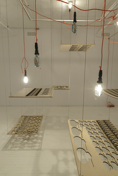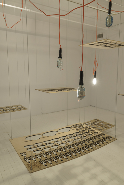 Sous ces moules à personnages cordés sur les feuilles de bois et arrachés à l’emporte-pièce, un fascinant spectacle de lumière apparaît. Alors que les négatifs de bois, suspendus, régissent les acteurs d’un drame potentiel, la place positive qui prend forme au sol laisse voir le chaos cauchemardesque, comme lorsque l’imagination d’un enfant, pervertie par une peur momentanée, lui permet de voir coup sur coup le mobile suspendu au-dessus de son lit et son ombre monstrueuse sur le mur, deux réalités intimement liées. Le sol envahi de lumière raconte l’histoire de la rue, la vie dans le désarroi, la liberté en impasse. Les motifs se répètent, s’enchevêtrent, se piratent l’un l’autre, se conjuguent, s’effacent; la répétition et l’envahissement, communs aux œuvres de Sayeh, fonctionnent comme un énorme labyrinthe, d’où il ne semble pas facile de sortir. On s’y perd, dans les recoins les plus magnifiques comme les plus épeurants. Ce labyrinthe d’ombres rappelle les dédales politiques et idéologiques du pays natal de l’artiste.