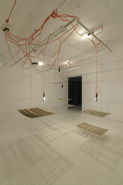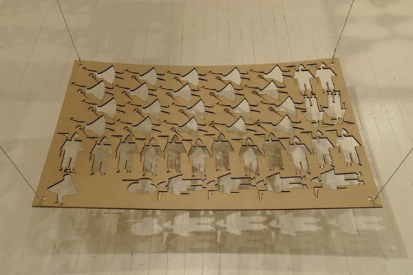 Au CIRCA, l’artiste propose un théâtre d’ombres s’étalant sur le plancher de la petite salle. À différentes hauteurs, dans une imperfection ordonnée, un chaos fonctionnel, des planches de bois découpées au laser sont suspendues au cœur de la galerie; suspendues comme le pays en impasse où il faut tout de même (sur)vivre en attendant le printemps. Les formes soustraites du bois représentent les éléments de la discorde, des mollahs, chefs de la répression religieuse, des tanks desquels il vaut mieux ne pas s’approcher, des soldats armés, du côté des méchants, des manifestants, qui en ont marre de se cacher pour vivre, des ninjas aussi mystérieux que dangereux, des petites filles, qu’on peut imaginer comme des princesses, et des armes à feu, tout un arsenal de carabines rudimentaires cordées, la preuve que tout ça peut réellement dégénérer.