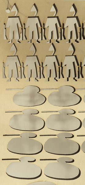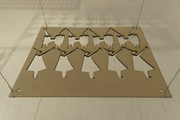 Les panneaux de bois que nous offre à voir Sayeh sont les retailles d’une autre exposition, Wolves in the Wall, présentée au Invisible Dog Art Center à Brooklyn plus tôt cet automne. Les personnages en négatif ont existé dans un autre contexte, si bien que les retailles présentées au CIRCA deviennent l’envers d’une autre histoire, quoique similaire, un point de vue de l’intérieur, intéressé. Cette posture économe, de survie, donne l’impression d’un making of qui devient aussi captivant que l’œuvre dont il documente la création – hostie ou retaille, bénie ou non, le goût est le même.