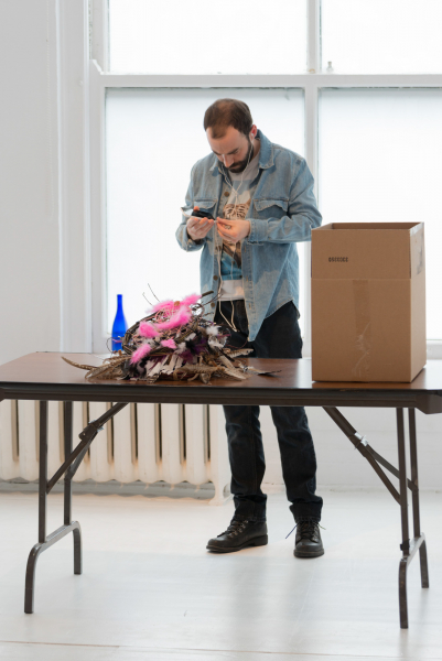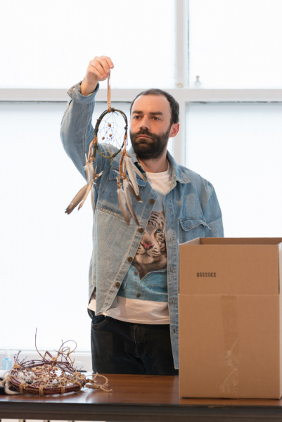 Les performances d’Hugo Nadeau opèrent ainsi à construire un nouvel ordre systémique à partir d’associations libres puisant à la fois dans le symbolique, le matériel, le corporel et le sensible. Il s’agit ici d’une intention manifeste de ré-enchanter le réel et d’accueillir un monde qui accepte la liberté symbolique et l’ordre sauvage, le culte et la culture populaire, le familier et le mystique.