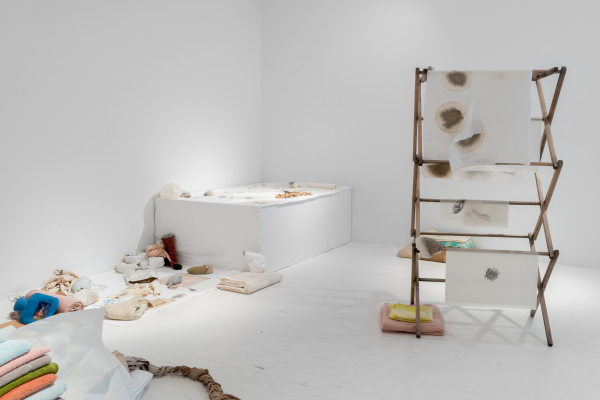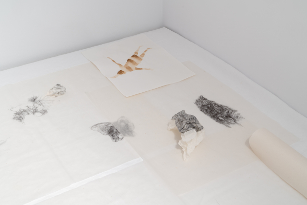 7. Sa temporalité transforme les objets en accessoires pour une performance potentielle de l’artiste ou de l’observateur. Dans cette forêt, labo, théâtre, chapelle se trouvent des stations de dégât, de deuil, de délice. La pratique n’aboutit à aucune amélioration, elle encourage plutôt les regards complices – s’incliner, s’accroupir, s’asseoir. Temps infini : ouverture momentanée. Sur les questions – est-ce que ce dessin plein de bavures veut vraiment aller ici? Qu’est-ce qui la retient de jouer avec la nourriture de l’esprit? L’art peut-il la sublimer dans son trop-plein/trop peu?