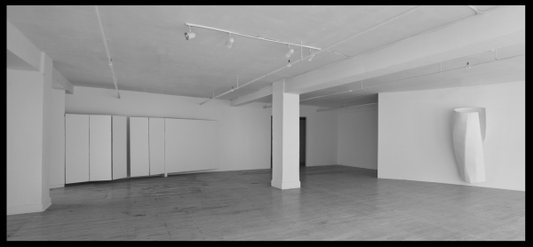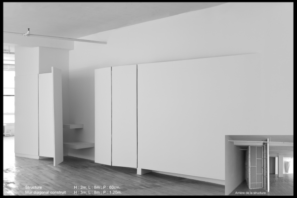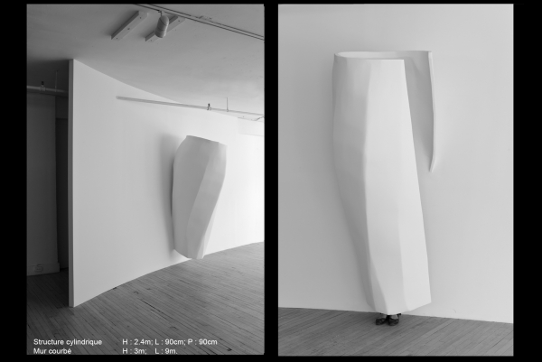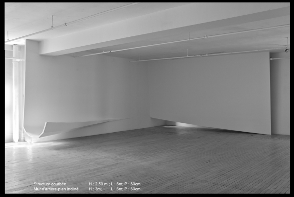 D’abord, l’on doit être attentif à l’ensemble, condition sine qua none pour être à même de saisir l’important rôle confié à la lumière dans la mise en espace. En jouant à combiner la lumière artificielle de la galerie et la lumière naturelle pénétrant par les fenêtres, l’artiste souligne aux yeux des visiteurs les légères modifications perceptuelles occasionnées par ce dispositif d’éclairage. Loin d’être une mise à distance de l’expérience qui nous est donnée de tenter en ce lieu, ce travail cherche à rendre consciente une expérience habituellement passée sous silence. Ensuite, il faut explorer les éléments sculpturaux eux-mêmes. Contrairement à ce qui était visible lors de son dernier passage dans la petite salle de la galerie, les formes ne s’échappent plus du mur, mais elles induisent l’idée qu’elles s’en écartent pour produire des interstices dans lesquels le visiteur est invité à prendre place. Dans un des cas, l’œuvre incite le spectateur à se pencher pour se glisser dessous ou à se faufiler subrepticement derrière elle. Dans une autre pièce de l’exposition, un espace est laissé vacant à l’intérieur de la structure afin que l’on s’y introduise. Enfin, dans le troisième cas, la pièce, qui est pliable et rétractable, prend des allures de cocon, mais aussi de poste d’observation.